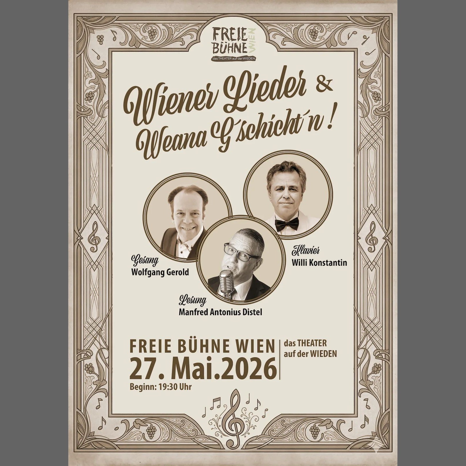 Dr. Wolfgang Gerold, Gesang – begleitet am Klavier von Willi Konstantin – und Manfred Antonius Distel, Lesung laden gemeinsam zu einem Wiener Abend als Benefizveranstaltung zugunsten